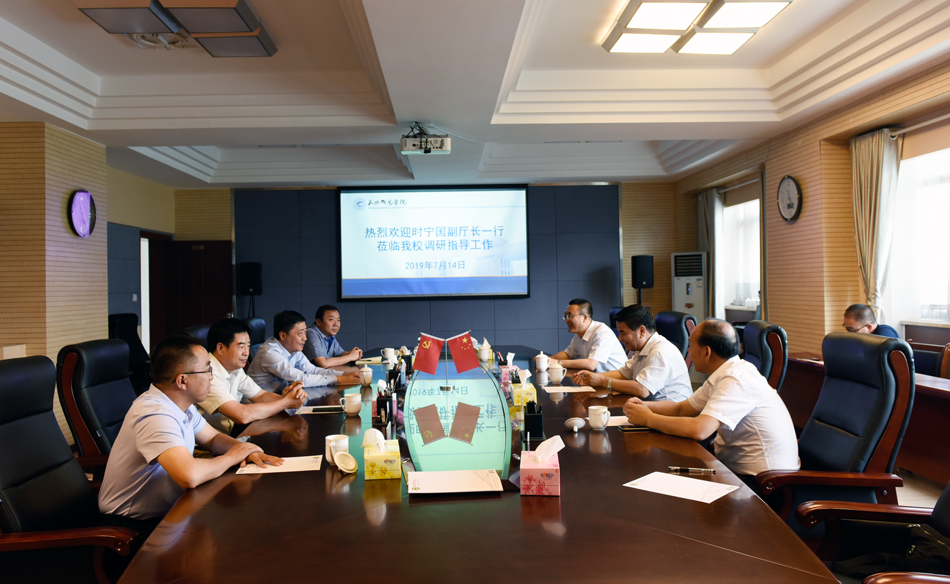 7月14日上午,甘肃省教育厅副厅长时宁国、职业教育与成人教育处处长李常锋来校调研,甘肃机电职业技术学院党委书记、校长坚葆林陪同调研。校长安涛,副校长汪聚应、安建平、王文东出席调研座谈会。座谈会上,安涛对省教育厅一直以来对学校的指导和帮助表示感谢,并从历史沿革、学校概况、师资队伍、学科专业、人才培养、科学研究、合作交流、思路目标、新校区选址等9个方面进行了工作汇报。时宁国对学校近年来所取得的办学成绩给予了充分肯定,并从学校转型发展、服务地方、产教融合、学生就业、新校区选址及规划等方面提出了指导性建议。