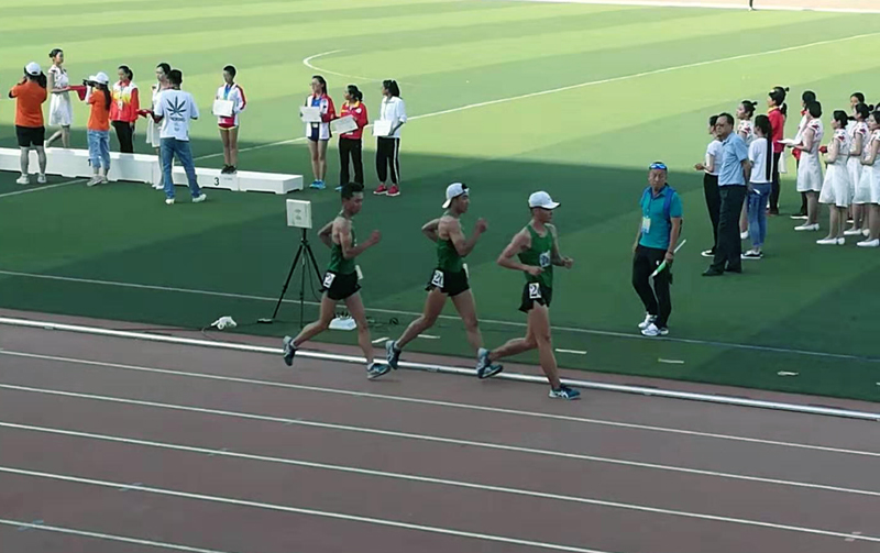 我校2018级运动训练1班周小军以46:34.70的成绩获得男子乙组10000米竞走金牌。