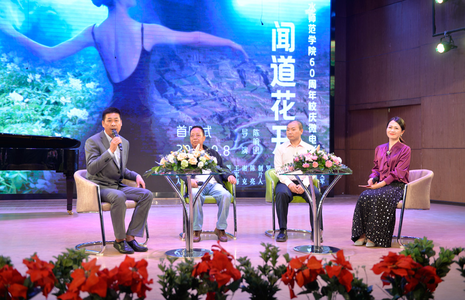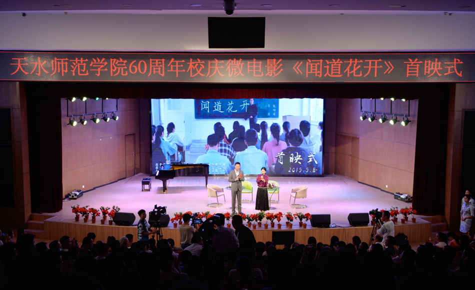 2019年10月12日,天水师范学院将迎来建校60周年华诞。9月8日晚,为庆祝建校60周年而专门创作的微电影《闻道花开》在学校音乐厅首映。学校校长安涛,副校长汪咏国、安建平,微电影赞助方甘肃第二建设集团有限责任公司党委书记、董事长王春景一行,导演陈响园和微电影主创团队,演职人员,学校80余名校友代表以及200余名师生参加首映式。